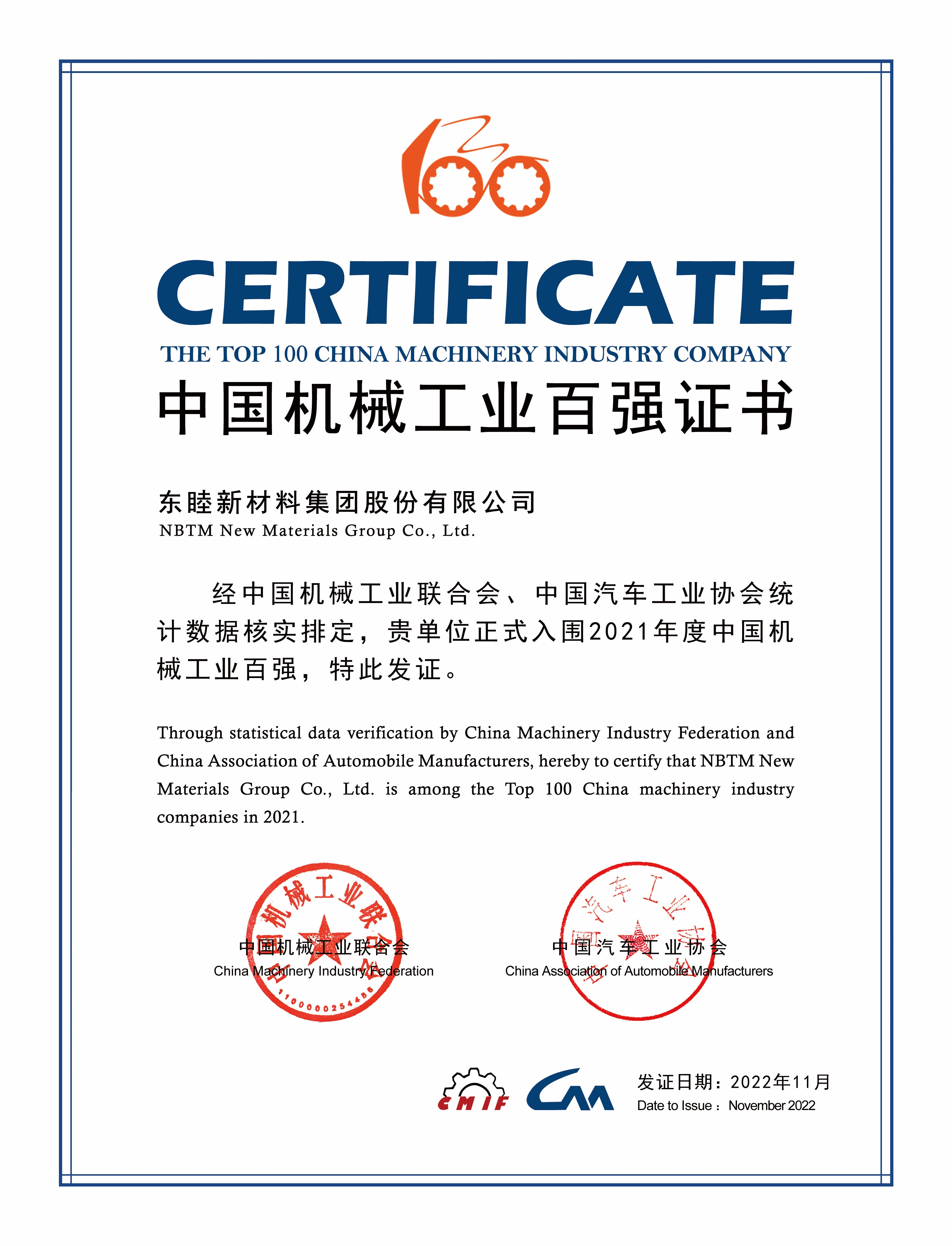 喜報!公司再次榮登中國機械工業(yè)百強榜單
